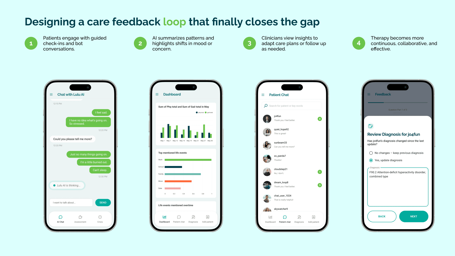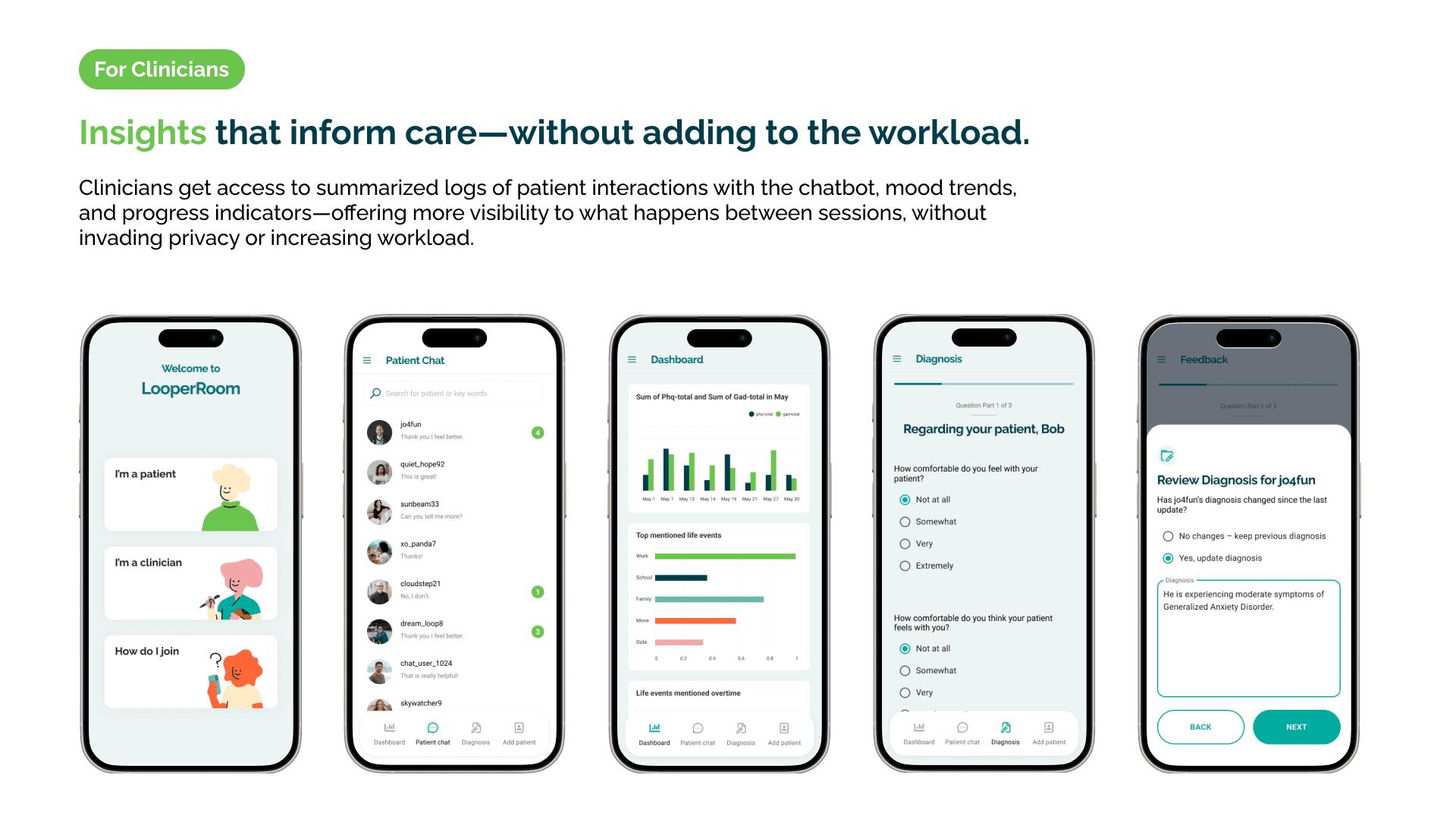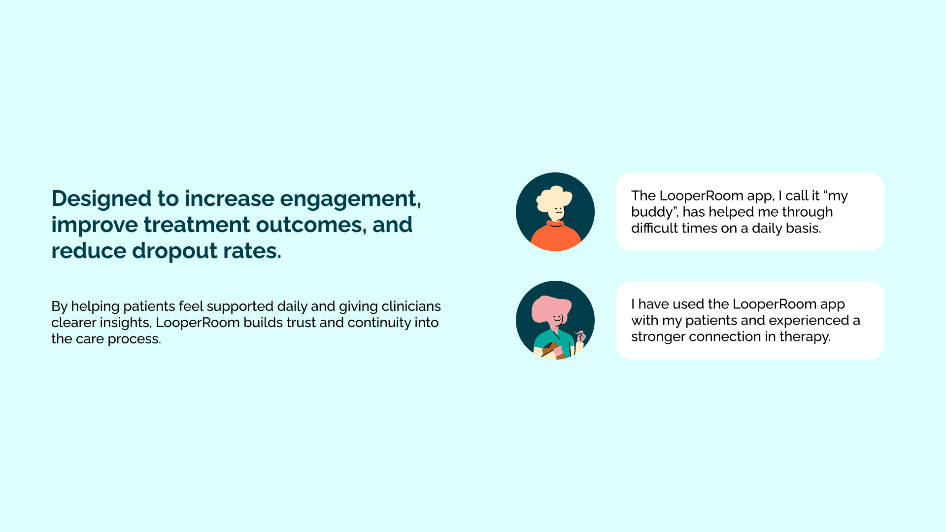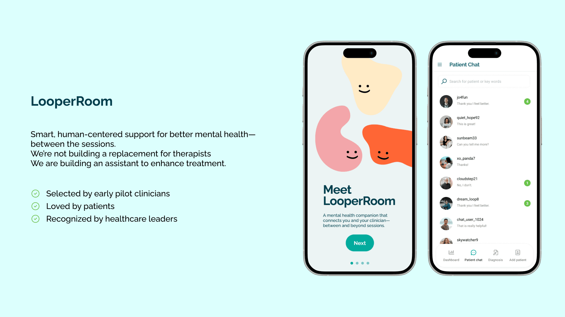 LooperRoom is a mental health support platform that connects patients and clinicians between therapy sessions—bridging one of the most overlooked gaps in care.